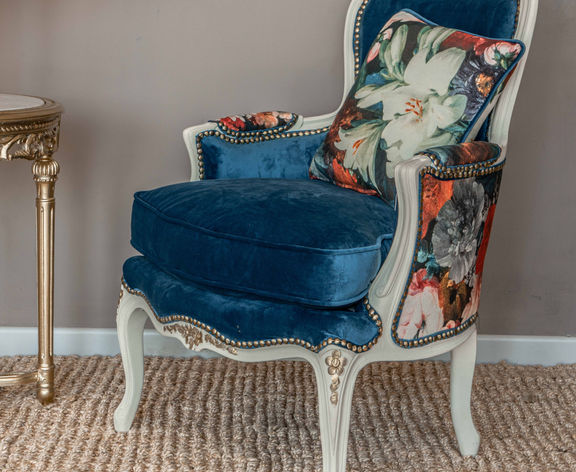 Charming bergere in the Louis XV style. The luminous blue of the velvet combined with a floral print with large patterns gives it an incessant glow.