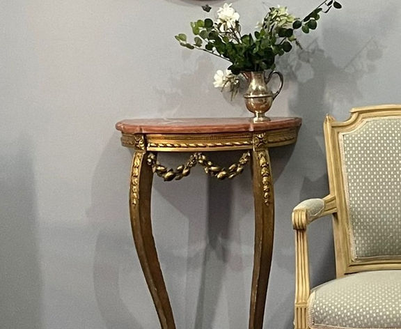 I really like the combination of this beautiful Louis XVI style console with an oval mirror. The console is decorated with a delicate garland and dates from the early 20th century. According to me it would make a charming set in a small entrance or a hallway for instance.