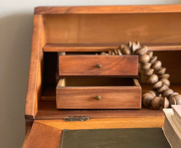 This pretty "donkey's back" desk will look great in a bedroom, living room or hallway. Its three external drawers and four small internal drawers will give you plenty of storage space. Its simple lines will easily complement your other furniture, whatever the style of your interior. The bronze details and inlays on the drawers add to its charm.