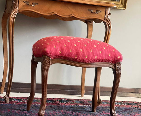 This exquisite small stool will be perfect in front of a vanity table, a small writing desk or as an occasional seat in a living room or bedroom, as well as in an entrance hall. Its elegantly curved legs, adorned with small engraved flowers, give it a graceful, elegant look. It has been upholstered in a cherry-red fabric reinterpreting a classic French motif.